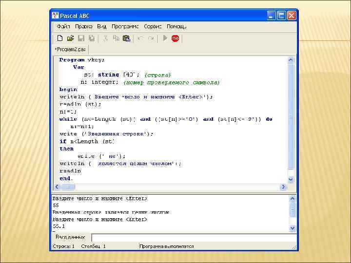 ПРИМЕР 2: НАПИСАТЬ ПРОГРАММУ, ПРОВЕРЯЮЩУЮ, ЯВЛЯЕТСЯ ЛИ ВВЕДЕННОЕ С КЛАВИАТУРЫ СТРОКА ЦЕЛЫМ ЧИСЛОМ? Program vkey; Var st: string [40]; {строка} n: integer; {номер проверяемого символа} begin writeln (‘Введите число и нажмите