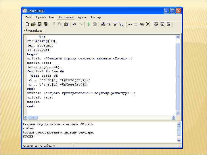 ПРИМЕР 3: НАПИСАТЬ ПРОГРАММУ, КОТОРАЯ В ВВЕДЕННОЙ С КЛАВИАТУРЕ СТРОКЕ ПРЕОБРАЗУЕТ СТРОЧНЫЕ БУКВЫ В ПРОПИСНЫЕ. Program simvol; Var st: string[80]; len: integer; i: integer; begin writeln (‘Введите строку и нажмите
