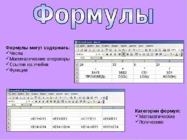 Формулой в Excel называется последовательность символов, начинающаяся со знака равенства “=“. В эту последовательность символов могут входить постоянные значения, ссылки на ячейки, имена, функции или операторы. Вводить формулу надо со знака равенства. Это надо для того, чтобы Excel понял, что в ячейку вводится именно формула, а не данные.