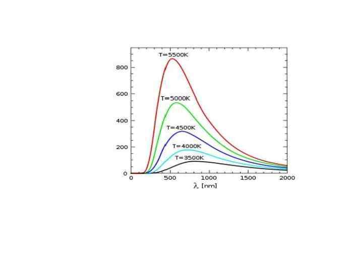 Рис. 2. Кривые потока излучения абсолютно чёрных тел с разной температурой. Наглядно можно увидеть, что возрастании температуры максимум излучения сдвигается в область коротких длин волн. Именно эту особенность и описывает закон Вина.