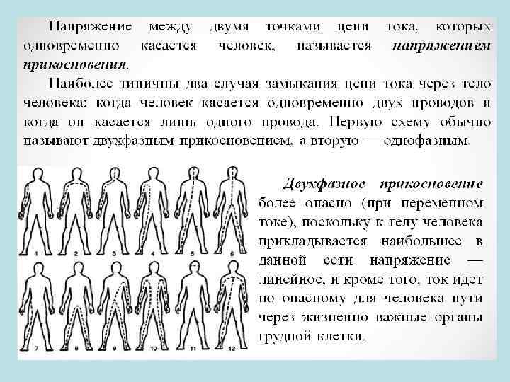 Характер и последствия воздействия на человека электрического тока зависят от следующих факторов: 1) значения тока, проходящего через тело человека; 2) электрического сопротивления человека; 3) уровня приложенного к человеку напряжения; 4) продолжительности воздействия тока; 5) пути тока через тело человека; 6) рода и частоты тока; 7) условий внешней среды и других факторов.