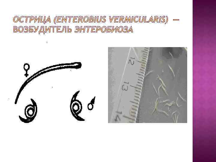 Локализация. Нижний отдел тонких кишок Географическое распространение. Повсеместное. Морфофизиологические особенности. Мелкий червь с выраженным половым диморфизмом: самка достигает в длину 12 мм, тело ее прямое, сзади заостренное. Самцы мельче (до 5 мм) и задний конец их тела свернут спирально. Продолжительность жизни самцов 7 недель, тогда как самки живут 5 -13 недель. Самцы обычно умирают после оплодотворения самки. Оплодотворенная самка живет в начале толстого кишечника, питаясь питательными веществами, которые проходят через желудочно-кишечный тракт. По истечении 4 недель наступает время откладывать яйца. Яйца овальны, несколько асимметричны, прозрачны и бесцветны, длиной до 50 мкм.