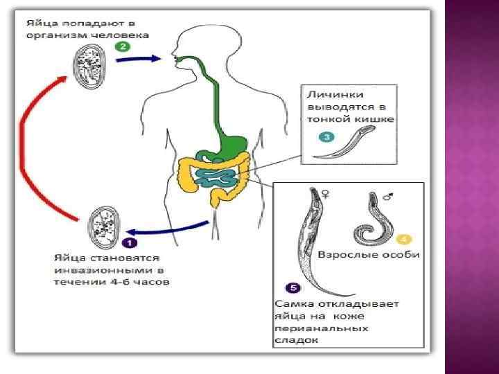Яйца достигают инвазионности после откладывания всего за несколько часов. Поэтому при энтеробиозе часто происходит аутоинвазия. Самки со зрелыми яйцами выползают из анального отверстия и откладывают яйца на коже промежности, вызывая при этом сильный зуд. При расчесывании зудящих мест яйца попадают на руки, затем на белье и игрушки. При проглатывании яиц из них быстро развиваются взрослые паразиты, продолжительность жизни которых около 1 мес.