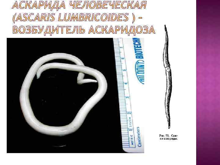Локализация. Тонкие кишки Географическое распространение. Практически повсеместное. Морфофизиологические особенности. Крупный гельминт, самки которого достигают 40 см длины, а самцы — 20 см. Зрелые яйца овальны и бугристы, оболочка их толстая и многослойная. Цвет желтовато -коричневый, длина до 60 мкм.