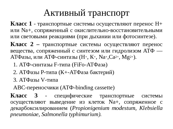 Активный транспорт Класс 1 — транспортные системы осуществляют перенос Н+ или Na +, сопряженный с окислительно-восстановительными или световыми реакциями (при дыхании или фотосинтезе). Класс 2 – транспортные системы осуществляют перенос вещества, сопряженный с синтезом или гидролизом АТФ — АТФазы, или АТФ-синтазы (Н+ , К+ , Na+ , Са 2+ , Mg 2+ ). 1. АТФ-синтазы F -типа ( Fi. Fo -АТФаза) 2. АТФазы Р-типа (К+-АТФаза бактерий) 3. АТФазы V -типа ABC -переносчики (АТФ- binding cassette ) Класс 3 — специфические транспортные системы осуществляют выведение из клеток Na +, сопряженное с декарбоксилированием ( Propionigenium modestum , Klebsiella pneumoniae , Salmonella typhimurium ).