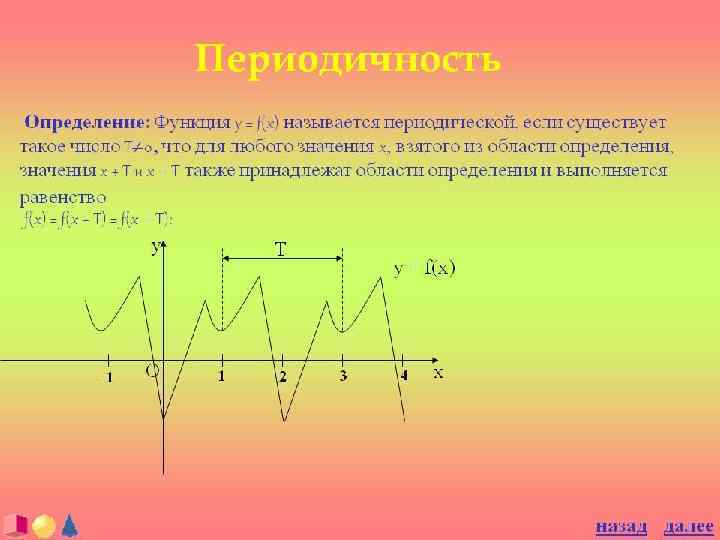 ПЕРИОД Число T ≠ 0 называют периодом равенства функции f(x), если для всех x верны f(x-T) = f(x+T) = f(x) (подразумевается, что x+T и x-T входят в область определения функции, если в нее входит x). Функцию называют периодической, если она имеет период (хотя бы один). Периодические функции естественно возникают при описании колебательных процессов. Если функция имеет период T, то периодами этой функции будут и числа -T, 2 T. . . – одним словом, все числа n. T, где T – целое число, не равное нулю. Наименьшим положительным периодом функции f называется такое число T, что T – период f, и ни одно положительное число, меньшее T, периодом f уже не является. Наименьший положительный период как синуса, так и косинуса равен 2π. Поскольку число 2π является периодом синуса и косинуса, оно будет также периодом тангенса и котангенса. Однако для этих функций 2π – не наименьший период: наименьшим положительным периодом тангенса и котангенса будет π: tg(x+π) = tgx и ctg(x+π) = ctgx.