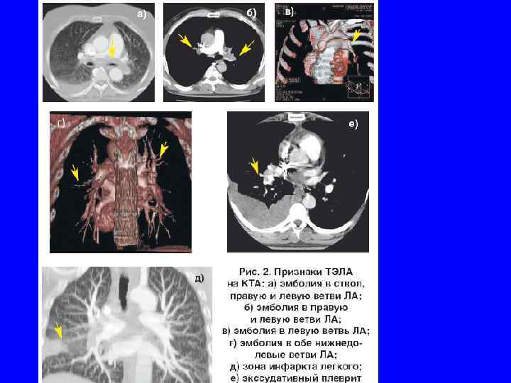 Алгоритм діагностики у разі підозри на масивну ТЕЛА Проводиться особами, що на I етапі мають високу клінічну ймовірність розвитку ТЕЛА (сума балів дорівнює 6 та більше) Клінічна та ЕКГ підозра на ТЕЛА Визначення D димера < 500 мг/л > 500 мг/л Оцінка клінічної ймовірності ТЕЛА + оцінка ймовірності ТЕЛА за даними ВПСЛ ТЕЛА ВПСЛ норма Низька клінічна ймовірність Середня клінічна ймовірність ( ) ТЕЛА (+) Висока клінічна ймовірність ВПСЛ середня + будь яка клінічна ймовірність ВПСЛ висока (+) Кольорове доплерівське сканування АПГ ТЕЛА (+) Низька клінічна ймовір ність АПГ Висока та середня клінічна ймовірність ТЕЛА (+)