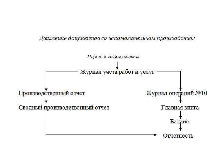 • Выполнение указанных задач возможно лишь при постоянной организации первичного аналитического и синтетического учета, повышении квалификации счетного персонала и применении компьютеризации учета. • Синтетический учет ведется в Главной книге в обобщенном виде в денежном выражении. Аналитический учет при мемориальноордерной форме учета ведется в Книге учета прочих производств; при журнально-ордерной форме бухгалтерского учета, учет затрат ведется в ведомости № 12, открываемой для каждого вспомогательного производства. В них затраты учитываются по отдельным видам продукции (работ и услуг) и статьям расходов. Ежемесячно итоги переносят в Журнал операций № 10.