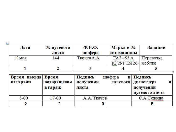 • Второй раздел «Последовательность выполнения задания» заполняется шофером и правильность записей должна быть подтверждена подписью и печатью грузоотправителя или получателя. • В третьем разделе определяются результаты работы, т. е. диспетчер, получив путевой лист, передает его для обработки бухгалтеру гаража.