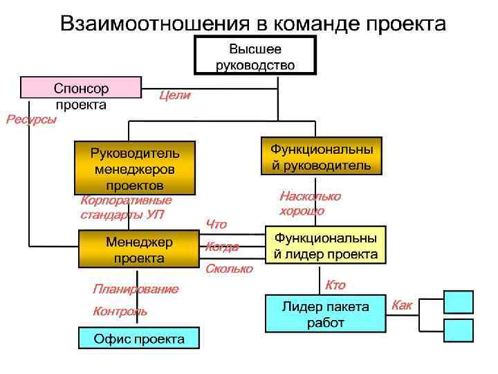 Діючі особи проекту (виконавці) • Керівник функціонального підрозділу направляє ресурси в затверджені проекти • Функціональний лідер проекту об'єднує лідер зусилля учасників проекту в рамках функції або підрозділу. Саме з ним взаємодіє менеджер проекту. • Лідер пакета робіт об'єднує зусилля робіт окремих осіб у рамках пакета робіт.