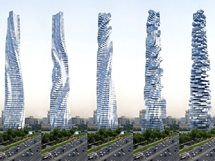 Динамическая башня в Дубае • В городе Дубай— построено первое здание в мире, способное изменять свой вешний вид. Каждый этаж здания двигается относительно земли и других этажей, 480 метровое здание вращает свои этажи на 380 градусов вокруг одной неподвижной колоны с помощью 80 энергетических ветровых турбин расположенных на каждом этаже