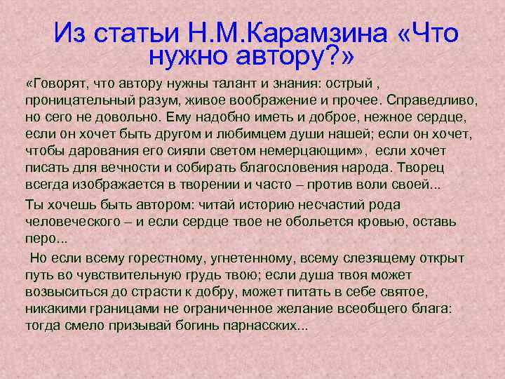 Из статьи Н. М. Карамзина «Что нужно автору? » «Говорят, что автору нужны талант и знания: острый , проницательный разум, живое воображение и прочее. Справедливо, но сего не довольно. Ему надобно иметь и доброе, нежное сердце, если он хочет быть другом и любимцем души нашей; если он хочет, чтобы дарования его сияли светом немерцающим» , если хочет писать для вечности и собирать благословения народа. Творец всегда изображается в творении и часто – против воли своей. . . Ты хочешь быть автором: читай историю несчастий рода человеческого – и если сердце твое не обольется кровью, оставь перо. . . Но если всему горестному, угнетенному, всему слезящему открыт путь во чувствительную грудь твою; если душа твоя может возвыситься до страсти к добру, может питать в себе святое, никакими границами не ограниченное желание всеобщего блага: тогда смело призывай богинь парнасских. . .