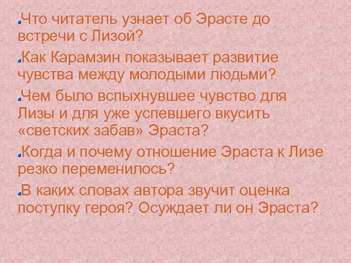 Что читатель узнает об Эрасте до встречи с Лизой? Как Карамзин показывает развитие чувства между молодыми людьми? Чем было вспыхнувшее чувство для Лизы и для уже успевшего вкусить «светских забав» Эраста? Когда и почему отношение Эраста к Лизе резко переменилось? В каких словах автора звучит оценка поступку героя? Осуждает ли он Эраста?