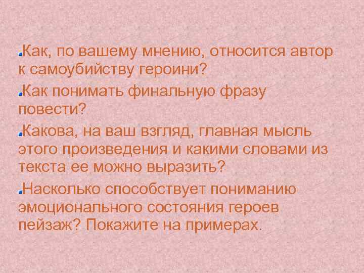 Как, по вашему мнению, относится автор к самоубийству героини? Как понимать финальную фразу повести? Какова, на ваш взгляд, главная мысль этого произведения и какими словами из текста ее можно выразить? Насколько способствует пониманию эмоционального состояния героев пейзаж? Покажите на примерах.