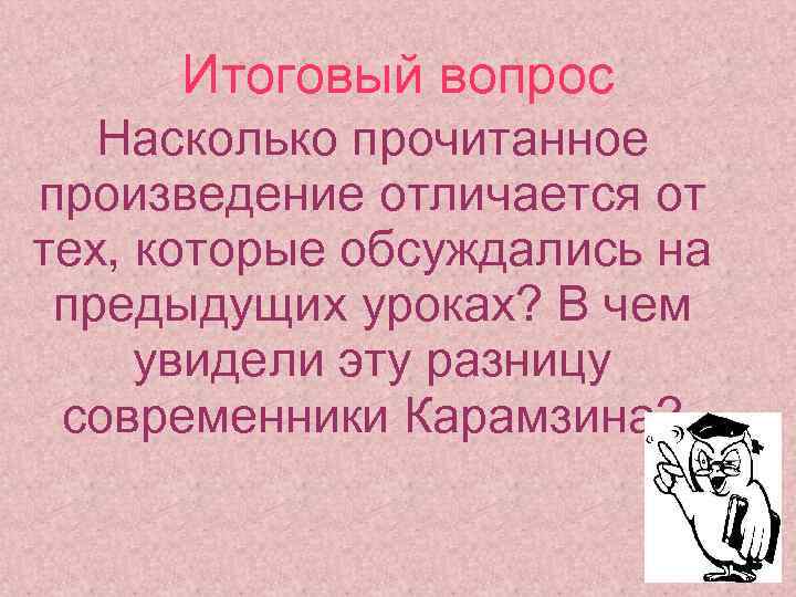 Итоговый вопрос Насколько прочитанное произведение отличается от тех, которые обсуждались на предыдущих уроках? В чем увидели эту разницу современники Карамзина?