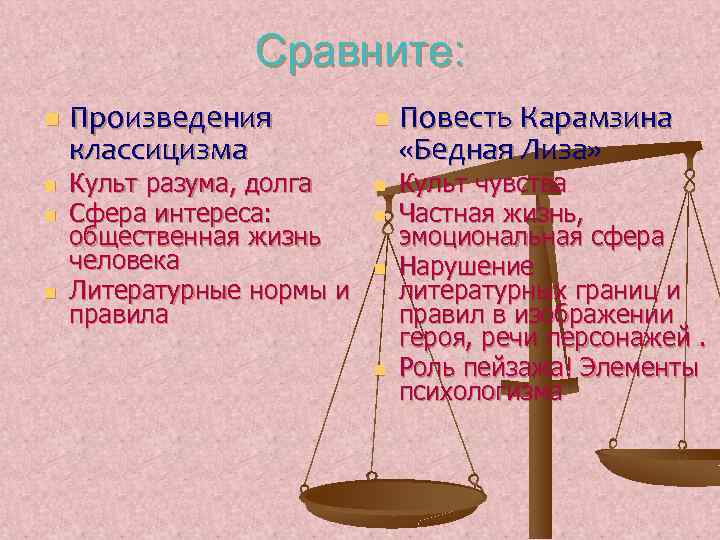 Сравните: n n Произведения классицизма Культ разума, долга Сфера интереса: общественная жизнь человека Литературные нормы и правила n n n Повесть Карамзина «Бедная Лиза» Культ чувства Частная жизнь, эмоциональная сфера Нарушение литературных границ и правил в изображении героя, речи персонажей. Роль пейзажа! Элементы психологизма