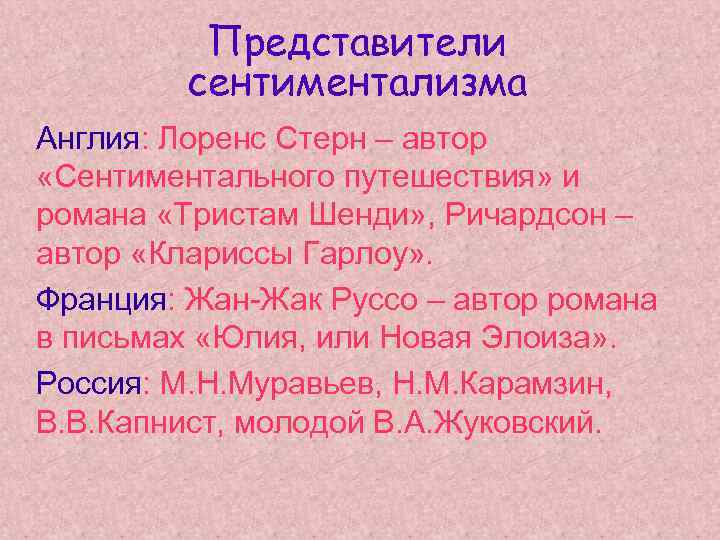 Представители сентиментализма Англия: Лоренс Стерн – автор «Сентиментального путешествия» и романа «Тристам Шенди» , Ричардсон – автор «Клариссы Гарлоу» . Франция: Жан-Жак Руссо – автор романа в письмах «Юлия, или Новая Элоиза» . Россия: М. Н. Муравьев, Н. М. Карамзин, В. В. Капнист, молодой В. А. Жуковский.