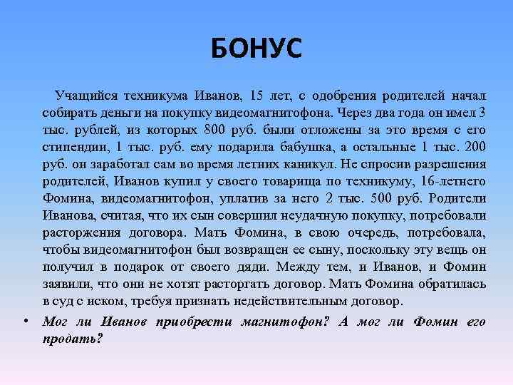 БОНУС Учащийся техникума Иванов, 15 лет, с одобрения родителей начал собирать деньги на покупку видеомагнитофона. Через два года он имел 3 тыс. рублей, из которых 800 руб. были отложены за это время с его стипендии, 1 тыс. руб. ему подарила бабушка, а остальные 1 тыс. 200 руб. он заработал сам во время летних каникул. Не спросив разрешения родителей, Иванов купил у своего товарища по техникуму, 16 -летнего Фомина, видеомагнитофон, уплатив за него 2 тыс. 500 руб. Родители Иванова, считая, что их сын совершил неудачную покупку, потребовали расторжения договора. Мать Фомина, в свою очередь, потребовала, чтобы видеомагнитофон был возвращен ее сыну, поскольку эту вещь он получил в подарок от своего дяди. Между тем, и Иванов, и Фомин заявили, что они не хотят расторгать договор. Мать Фомина обратилась в суд с иском, требуя признать недействительным договор. • Мог ли Иванов приобрести магнитофон? А мог ли Фомин его продать?