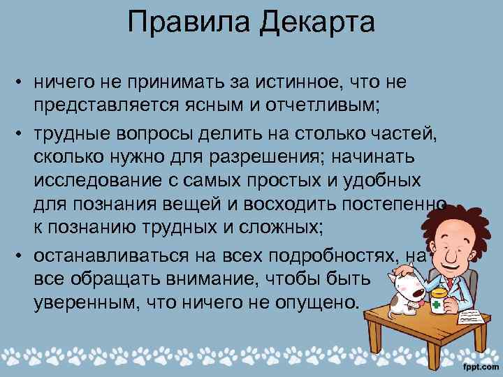 Правила Декарта • ничего не принимать за истинное, что не представляется ясным и отчетливым; • трудные вопросы делить на столько частей, сколько нужно для разрешения; начинать исследование с самых простых и удобных для познания вещей и восходить постепенно к познанию трудных и сложных; • останавливаться на всех подробностях, на все обращать внимание, чтобы быть уверенным, что ничего не опущено.