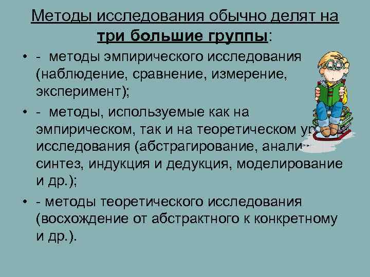 Методы исследования обычно делят на три большие группы: • - методы эмпирического исследования (наблюдение, сравнение, измерение, эксперимент); • - методы, используемые как на эмпирическом, так и на теоретическом уровне исследования (абстрагирование, анализ и синтез, индукция и дедукция, моделирование и др. ); • - методы теоретического исследования (восхождение от абстрактного к конкретному и др. ).