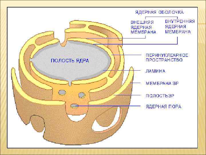 ЯДРО Строение: Ядерная оболочка (2 мембранная): Наружная мембрана Внутренняя мембрана. 2. Ядерный сок (кариоплазма) 3. Ядрышко 4. Хромосомы (хроматин): ДНК Белок. 1.