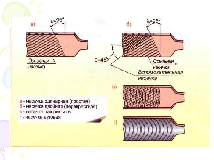 Виды насечек напильника 1. Рашпильная-применяют для обработки очень мягких металлов и неметаллических материалов –кожи , резины и др. 2. Двойная –применяют для опиливания стали , чугуна и других твердых материалов с большим сопротивлением резанию. 3. Одинарная –могут снимать широкую стружку , равную длине всей насечки. Их применяют при опиливании мягких металлов и сплавов ( латуни , цинка, баббита, свинца, алюминия, бронзы и т. п. 1