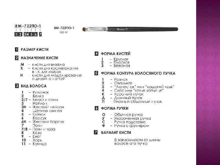 Кистью в форме веера убираются излишки пудры, теней или румян. Она хорошо, не размазывая, устраняет осыпавшиеся частички средств 111 Кисти, похожие на маленькие расчесочки используются для разделения ресниц и придания формы бровям 105, 104 Кисть кабуки — для рассыпчатой или компактной пудры. Хорошо вбирает пудру, легко растушевывает 80 Спонж (аппликатор). Используется для нанесения сухих или жидких теней для век 102 Кисть для нанесения туши на ресницы Выглядит, как спиральная щеточка, изготовленная из короткой щетины 103
