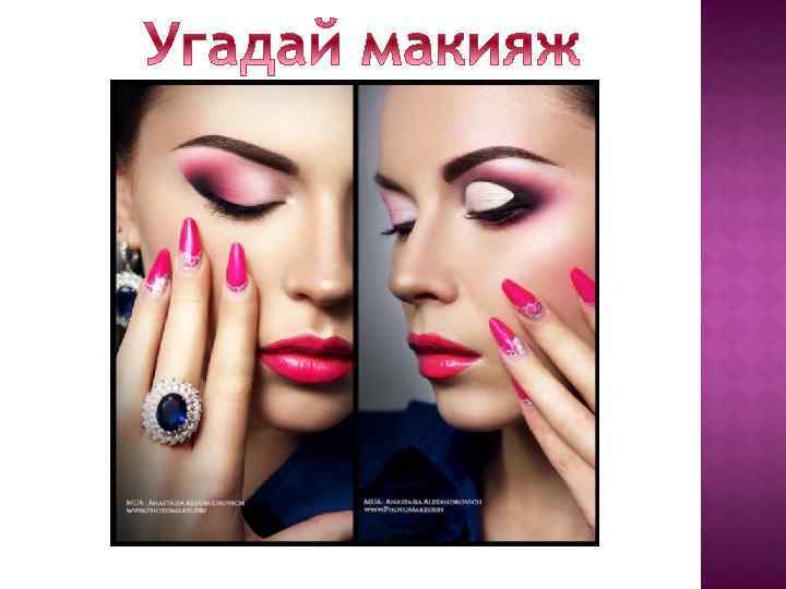 5) Румяна Кистью для румян набираем небольшое количество продукта, обязательно стряхиваем с кисточки лишнее, слегка постучав по ее ручке. Если вы хотите подчеркнуть овал лица и зрительно углубить скулы, нужно выбирать холодно-коричневые или шоколадные тона. Наносить их следует, растушевав на подскульной впадине от периферии к центру. Надо как бы навести тень от высокой скулы. Если же вы хотели бы подчеркнуть свежесть лица, лучше предпочесть нежноперсиковые или морозно-розовые оттенки румян. Перед нанесением нужно встать перед зеркалом и улыбнуться самой себе. Наносим небольшое количество румян, центрируя их на «яблочках» , образовавшихся на лице при улыбке.