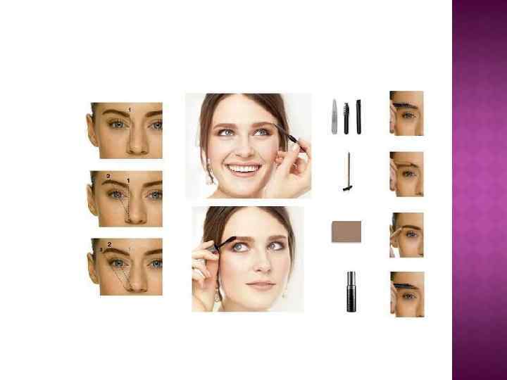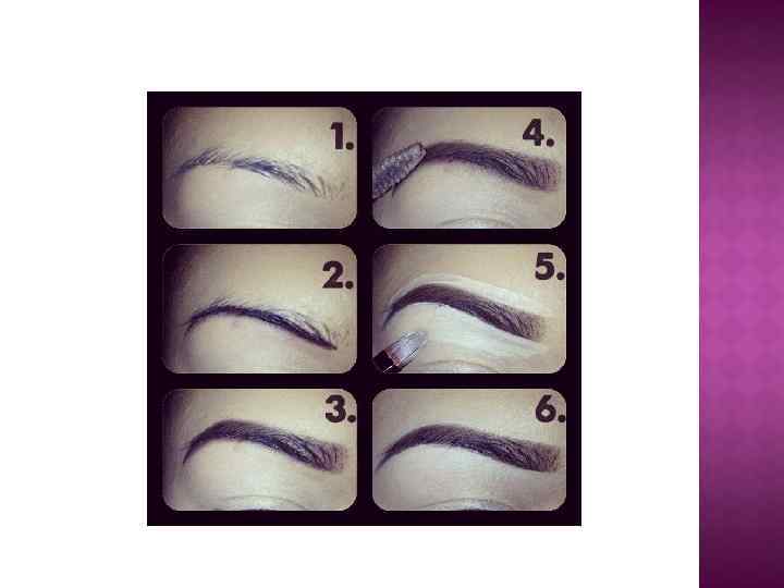 6) Брови Выбираем карандаш, а лучше тени для бровей цвета, попадающего в цвет корней ваших волос. Начните подчеркивать бровь с середины и изгиба. Изгиб брови и ее окончание должны быть самыми четкими, а основная часть ее должна быть заполненной, но растушеванной. Изгиб брови и кончик следует слегка приподнимать. Этот прием визуально приоткрывает глаз и делает макияж более выразительным.
