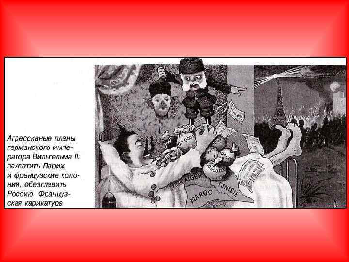 Обострение противоречий между двумя военными блоками в Европе – Тройственным союзом (Германия, Италия и Австро-Венгрия) и Антантой (Англия, Россия, Франция).