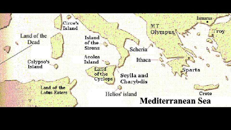 «Одиссея» Земля лестригонов Пенелопа, Жена Одиссея Итака О-в Цирцеи Сирены Земля циклопов Земля лотофагов Троя Балканский п-в Между Сциллой и Харибдой Калипсо Средиземное море Одиссей, царь Итаки