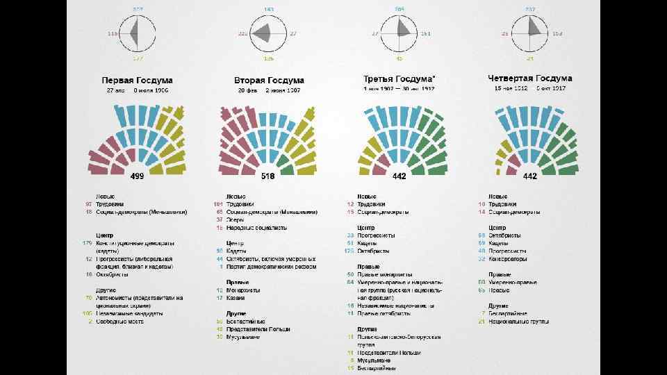 Третья Госдума (1907 -1912) От правых к левым: 2% 4% 6% 6% 34% 12% 35% Монархисты Октябристы Кадеты Прогрессисты Трудовики РСДРП Национальные группы и беспартийные
