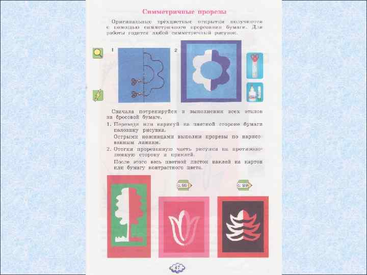 План работы 1. Прочитай внимательно тему урока. 2. Поставь перед собой цель, которую ты должен достигнуть в конце урока. 3. Определи задачи, которые перед тобой стоят. 4. Прочитай внимательно план работы. 5. Приготовь рабочее место: все инструменты и материалы положи на столе по правилам, которые мы изучали в 1 и 2 -ом классах. • Для работы нам необходимы: учебник, материалы, которые указаны в учебнике на стр. 47. 6. Изучи внимательно материал в учебнике. Тема: Симметричные прорезы. стр. 47(смотри отсканированный вариант ниже).