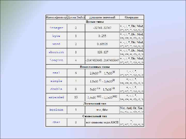 Типы данных в Паскале Идентификатор Диапазон значений Целые типы Integer -32678 … 32767 longint -2147483648… 2147483647 Вещественные типы real 2, 9× 10 -39 … 1, 7× 1038 single 1, 5× 10 -45 … 3, 4× 1038 Логический тип boolean true, false Символьный тип char Все символы кода ASCII