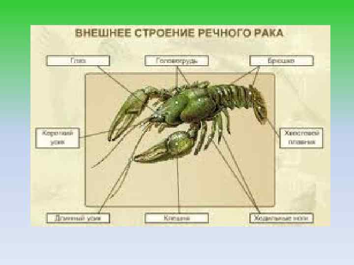 Что мы знаем о Ракообразных: Строение тела Головогрудь и брюшко Покровы тела Прочная хитиновая кутикула, пропитанная солями кальция, железа и кремния Органы головы На голове видоизмененные конечности: антеннулы, антенны, челюсти Строение конечностей Множество членистых мультифункциональных конечностей, Среда обитания Донные или планктонные жители всех типов водоемов. Живут в чистой воде Образ жизни Днем прячутся в норах, под камнями, а ночью выходят в поисках пищи (всеядные) Линька рост