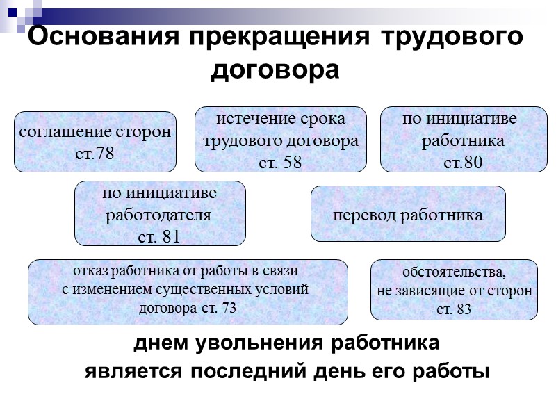 Основания прекращения трудового договора днем увольнения работника является последний день его работы соглашение сторон ст.78 по инициативе работодателя ст. 81 отказ работника от работы в связи с изменением существенных условий договора ст. 73 обстоятельства, не зависящие от сторон ст. 83 перевод работника истечение срока трудового договора ст. 58 по инициативе работника ст.80
