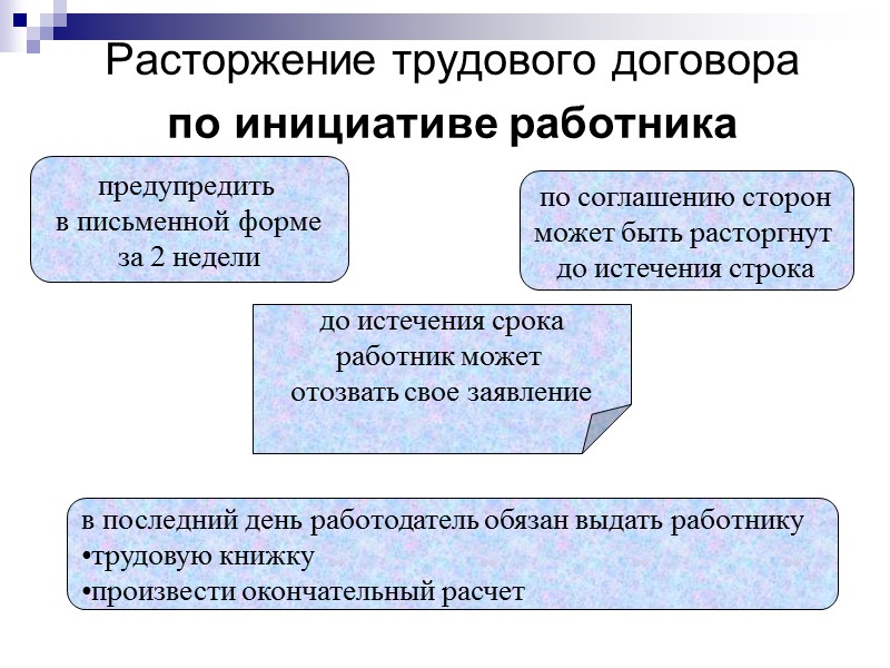 Расторжение трудового договора по инициативе работника предупредить в письменной форме за 2 недели по соглашению сторон может быть расторгнут до истечения строка до истечения срока работник может отозвать свое заявление в последний день работодатель обязан выдать работнику трудовую книжку произвести окончательный расчет