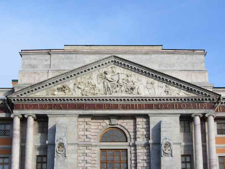 • Самый интригующий фрагмент в оформлении фасада замка – надпись над главным входом: «Дому твоему подобаетъ святыня Господня въ долготу дней» . • Это библейское изречение, цитата из 92 -го псалма, возвеличивающего деяния Господа. • Первоначально надпись предназначалась для Исаакиевского собора, но по распоряжению Павла I была перенесена на замок. • С этим изречением связана легенда о некой юродивой, которая накануне 1801 года напророчила Павлу Петровичу столько лет жизни, сколько букв в этом тексте. • Вышло 47…