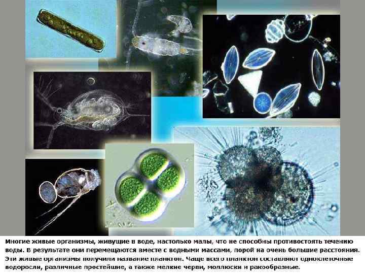 Планктон – от греческого слова «блуждающий» . Планктон образуют животные и водоросли, которые пассивно плавают в толще воды. Они не имеют двигательного аппарата, например, плавников, и передвигаются благодаря течениям. Планктон служит пищей многим рыбам и некоторым китам. Общий вес планктона в Мировом океане составляет 36 млрд. тонн.