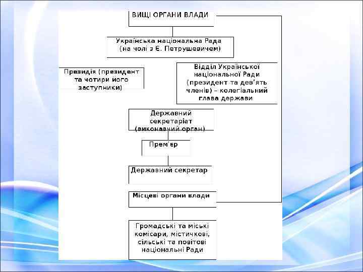 § Українська національна Рада - вищий орган влади західно -українських земель на чолі з Євгеном Петрушевичем. Утворено 19 жовтня 1918 року. § Львівське повстання - дії військових на чолі з Д. Вітовським по захопленню влади у місті Львові 1 листопада 1918 року § Тимчасовий Державний Секретаріат – уряд ЗУНР на чолі з К. Левицьким, утворений 9 листопада 1918 року