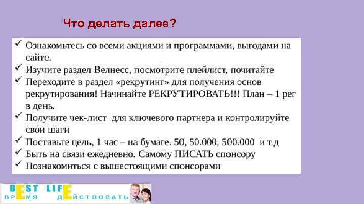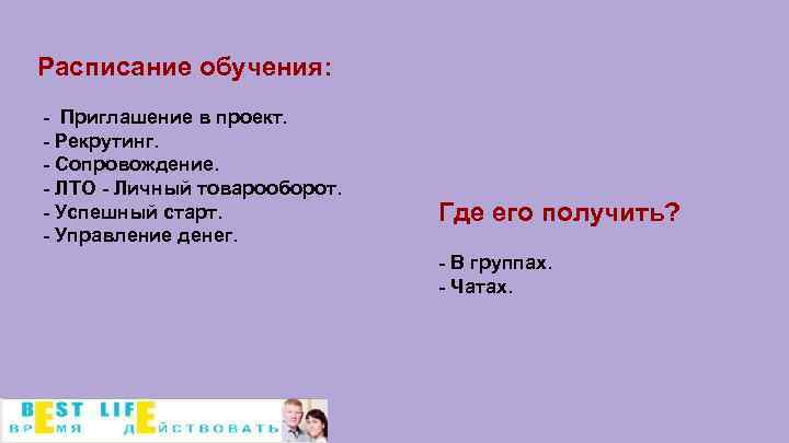 Расписание обучения: - Приглашение в проект. - Рекрутинг. - Сопровождение. - ЛТО - Личный товарооборот. - Успешный старт. - Управление денег. Где его получить? - В группах. - Чатах.