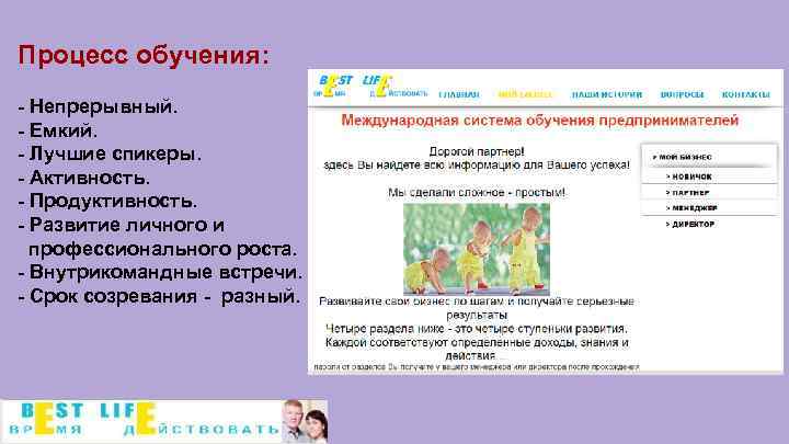 Процесс обучения: - Непрерывный. - Емкий. - Лучшие спикеры. - Активность. - Продуктивность. - Развитие личного и профессионального роста. - Внутрикомандные встречи. - Срок созревания - разный.