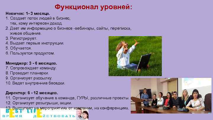 Функционал уровней: Новичок: 1 - 3 месяца. 1. Создает поток людей в бизнес, тех, кому интересен доход. 2. Дает им информацию о бизнесе -вебинары, сайты, переписка, живое общение. 3. Регистрирует. 4. Выдает первые инструкции. 5. Обучается. 6. Пользуется продуктом. Менеджер: 3 - 6 месяцев. 7. Сопровождает команду. 8. Проводит планерки. 9. Организует рассылку. 10. Ведет внутренние беседки. Директор: 6 - 12 месяцев. 11. Организует обучение в команде, ГУРЫ, различные проекты. 12. Организует розыгрыши, акции. 13. Выступает на мероприятиях от компании, на конференциях.