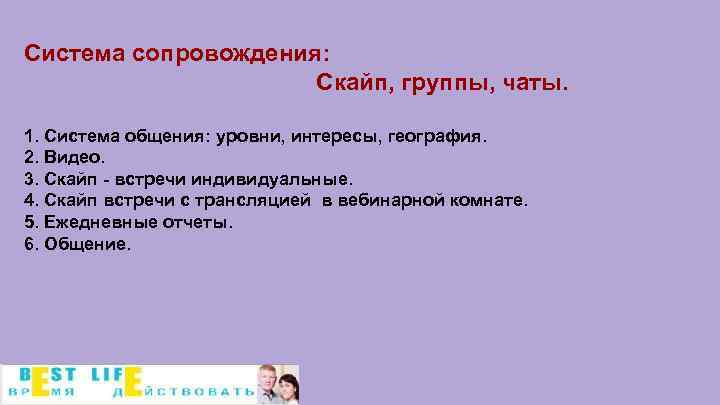 Система сопровождения: Скайп, группы, чаты. 1. Система общения: уровни, интересы, география. 2. Видео. 3. Скайп - встречи индивидуальные. 4. Скайп встречи с трансляцией в вебинарной комнате. 5. Ежедневные отчеты. 6. Общение.