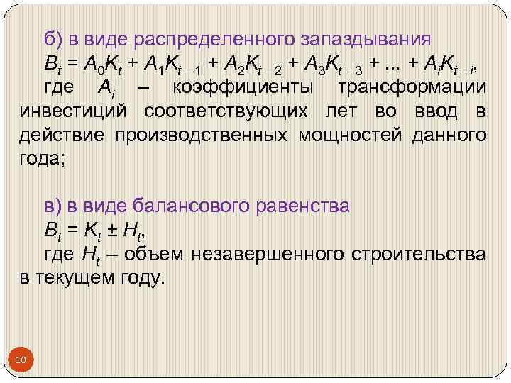 б) в виде распределенного запаздывания Bt = A 0 Kt + A 1 Kt – 1 + А 2 Kt – 2 + А 3 Kt – 3 +. . . + Аi. Kt –i, где Аi – коэффициенты трансформации инвестиций соответствующих лет во ввод в действие производственных мощностей данного года; в) в виде балансового равенства Вt = Kt ± Нt, где Нt – объем незавершенного строительства в текущем году. 10