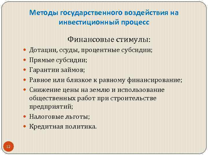 Методы государственного воздействия на инвестиционный процесс Финансовые стимулы: Дотации, ссуды, процентные субсидии; Прямые субсидии; Гарантии займов; Равное или близкое к равному финансирование; Снижение цены на землю и использование общественных работ при строительстве предприятий; Налоговые льготы; Кредитная политика. 12