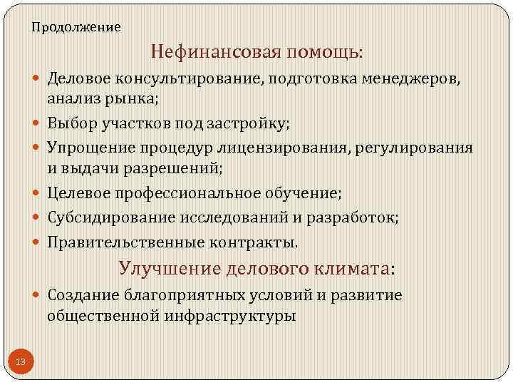 Продолжение Нефинансовая помощь: Деловое консультирование, подготовка менеджеров, анализ рынка; Выбор участков под застройку; Упрощение процедур лицензирования, регулирования и выдачи разрешений; Целевое профессиональное обучение; Субсидирование исследований и разработок; Правительственные контракты. Улучшение делового климата: Создание благоприятных условий и развитие общественной инфраструктуры 13