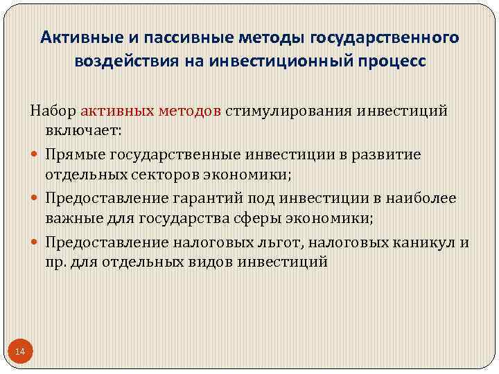 Активные и пассивные методы государственного воздействия на инвестиционный процесс Набор активных методов стимулирования инвестиций включает: Прямые государственные инвестиции в развитие отдельных секторов экономики; Предоставление гарантий под инвестиции в наиболее важные для государства сферы экономики; Предоставление налоговых льгот, налоговых каникул и пр. для отдельных видов инвестиций 14