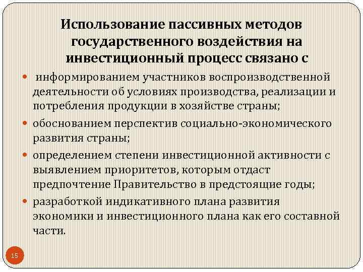 Использование пассивных методов государственного воздействия на инвестиционный процесс связано с информированием участников воспроизводственной деятельности об условиях производства, реализации и потребления продукции в хозяйстве страны; обоснованием перспектив социально-экономического развития страны; определением степени инвестиционной активности с выявлением приоритетов, которым отдаст предпочтение Правительство в предстоящие годы; разработкой индикативного плана развития экономики и инвестиционного плана как его составной части. 15