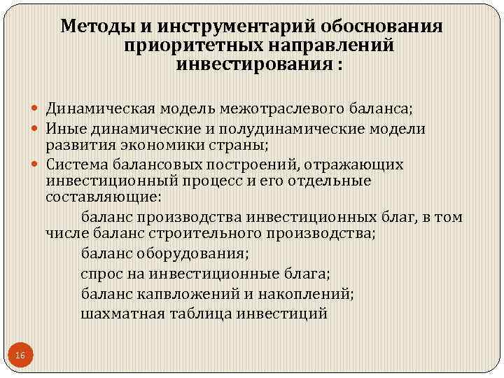 Методы и инструментарий обоснования приоритетных направлений инвестирования : Динамическая модель межотраслевого баланса; Иные динамические и полудинамические модели развития экономики страны; Система балансовых построений, отражающих инвестиционный процесс и его отдельные составляющие: баланс производства инвестиционных благ, в том числе баланс строительного производства; баланс оборудования; спрос на инвестиционные блага; баланс капвложений и накоплений; шахматная таблица инвестиций 16